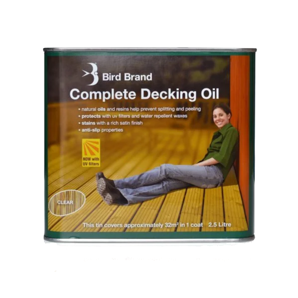 DaugiauBird Brand Complete Decking Oil – alyva, skirta terasoms, lauko baldams ir medinėms konstrukcijoms apsaugoti. Giliai įsigeria, saugo nuo UV spindulių, drėgmės ir trinties. Tinka visų rūšių medienai, tame tarpe ir kietai ar egzotinei (ąžuolas, tikas, maumedis). Matinis efektas, saugi aplinkai ir gyvūnams.