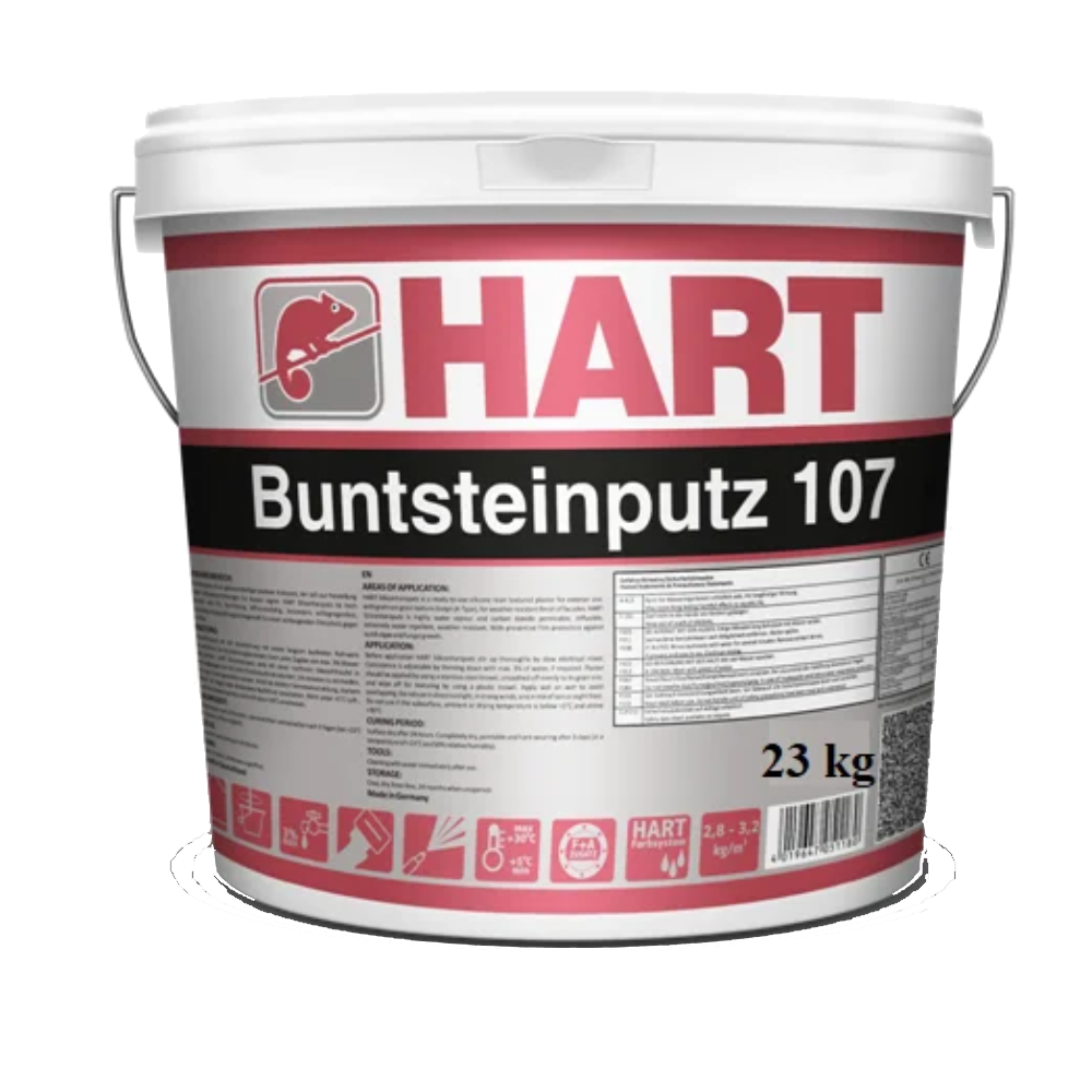 DaugiauHART Buntsteinputz 107 – dekoratyvinis mozaikinis tinkas be tirpiklių, atsparus drėgmei, šarmams ir teršalams. Naudojamas cokoliams ir fasadams, ypač šiltinimo sistemose. Ekologiškas, bekvapis, difuziškas, su vidutinio garų pralaidumo ir žemos vandens įgeriamumo klasėmis.