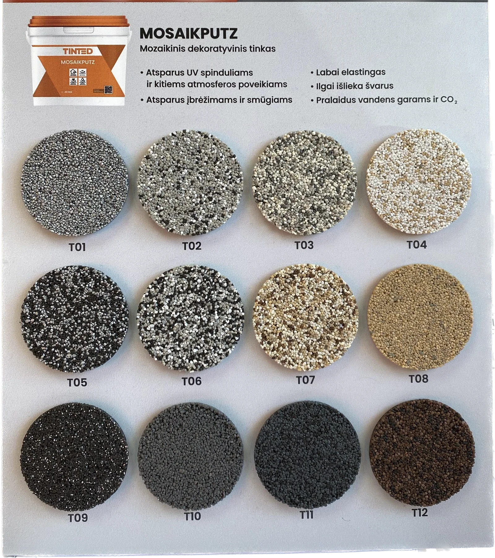 DaugiauTINTED Mosaikputz – dekoratyvinis mozaikinis tinkas su spalvotu kvarco akmeniu, skirtas išorės ir vidaus sienoms, kolonoms, pertvaroms. Tinka betonui, mineraliniam tinkui ir ETICS sistemoms. Hidrofobinis, atsparus drėgmei, naudojamas su PutzGrund gruntu.